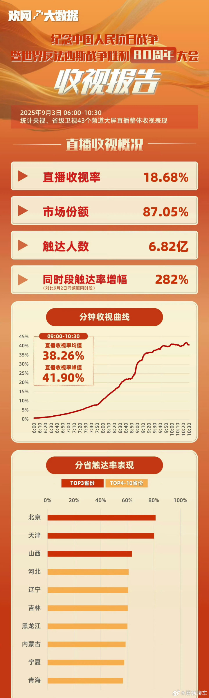 欢网大数据发布《中国人民抗日战争暨世界反法西斯战争胜利80周年纪念大会收视报告》。报告统计央视及43个省级卫视频道06:00-10:30的大屏直播数据:整体直播收视率达18.68%,占同时段总市场份额87.05%,累计触达观众6.82亿人,较9月2日同频道同时段触达率激增282%。